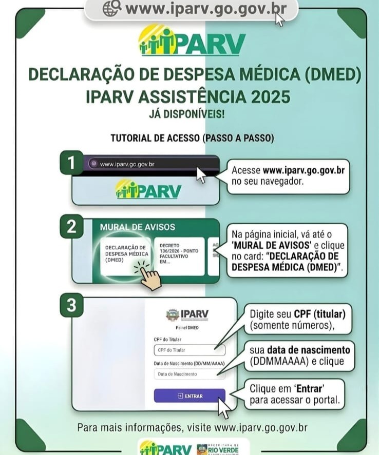Para acessar, o usuário deve entrar no endereço www.iparv.go.gov.br, localizar na página inicial o Mural de Avisos e clicar no card “Declaração de Despesa Médica (DMED)”. Em seguida, basta informar o CPF do titular e a data de nascimento, e clicar em “Entrar” para visualizar o documento.